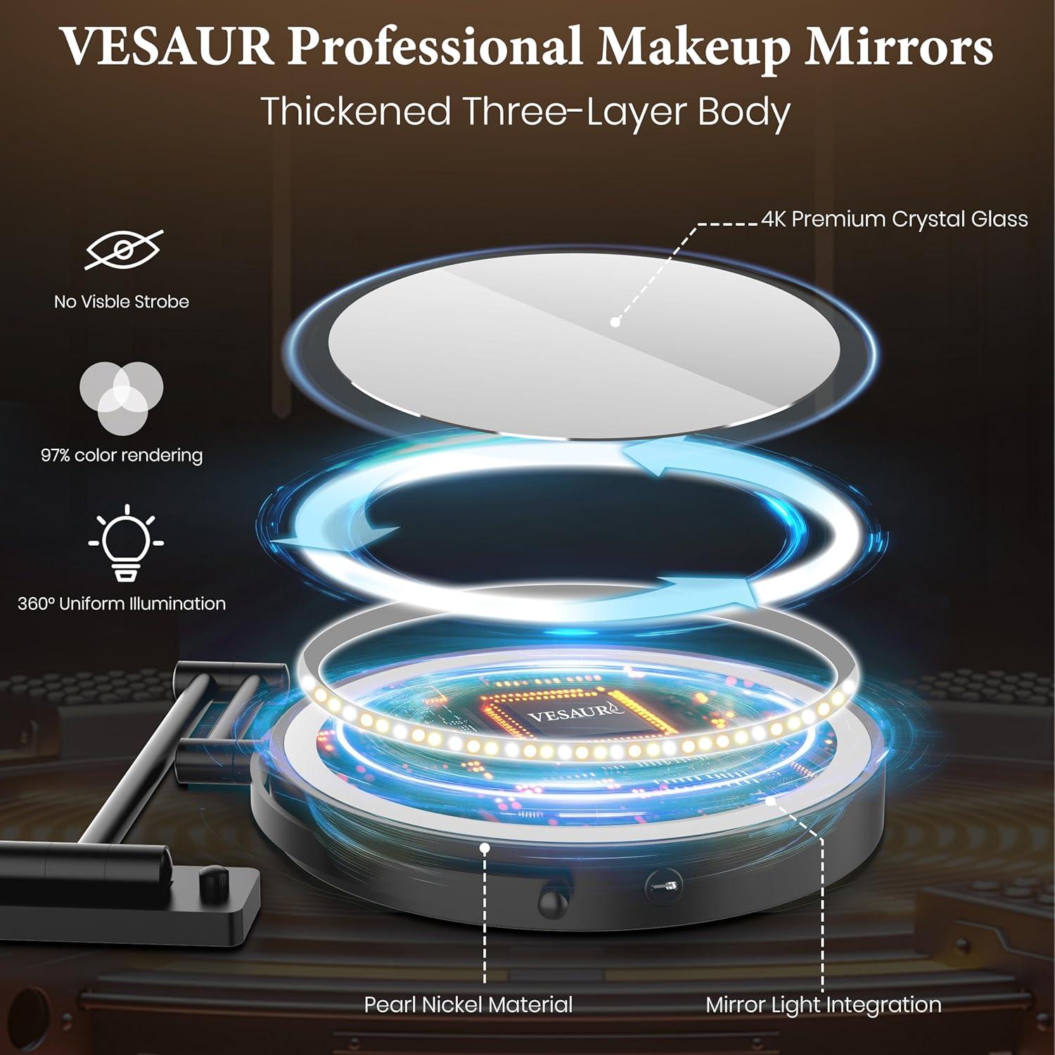 9″ 15X & 8.5″ 1X/10X Rechargeable Wall-Mounted Lighted Makeup Mirrors, 5000mAh HD Magnifying with 3 Color Dimmable Lights, 90 Shadowless LEDs, Touch Screen, 17″ Extendable 360° Swivel Vanity Mirrors
