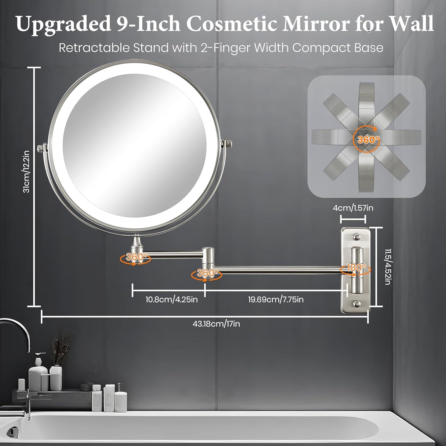 【Ultra-clear 1X/20X Magnification & Black Nickel Anti-Fog Bathroom Mirror 】This 20X magnifying mirror with light offers 1X for overall makeup. The 20X HD magnification ensures clear visibility without glare for precise makeup application. You can see every hair to create flawless, symmetrical brows.The 9″ fog-free wall-mounted lighted makeup mirror resists fogging, features senior pearl nickel frame, seamless crystal glass (reduces glare), and explosion-proof safety design