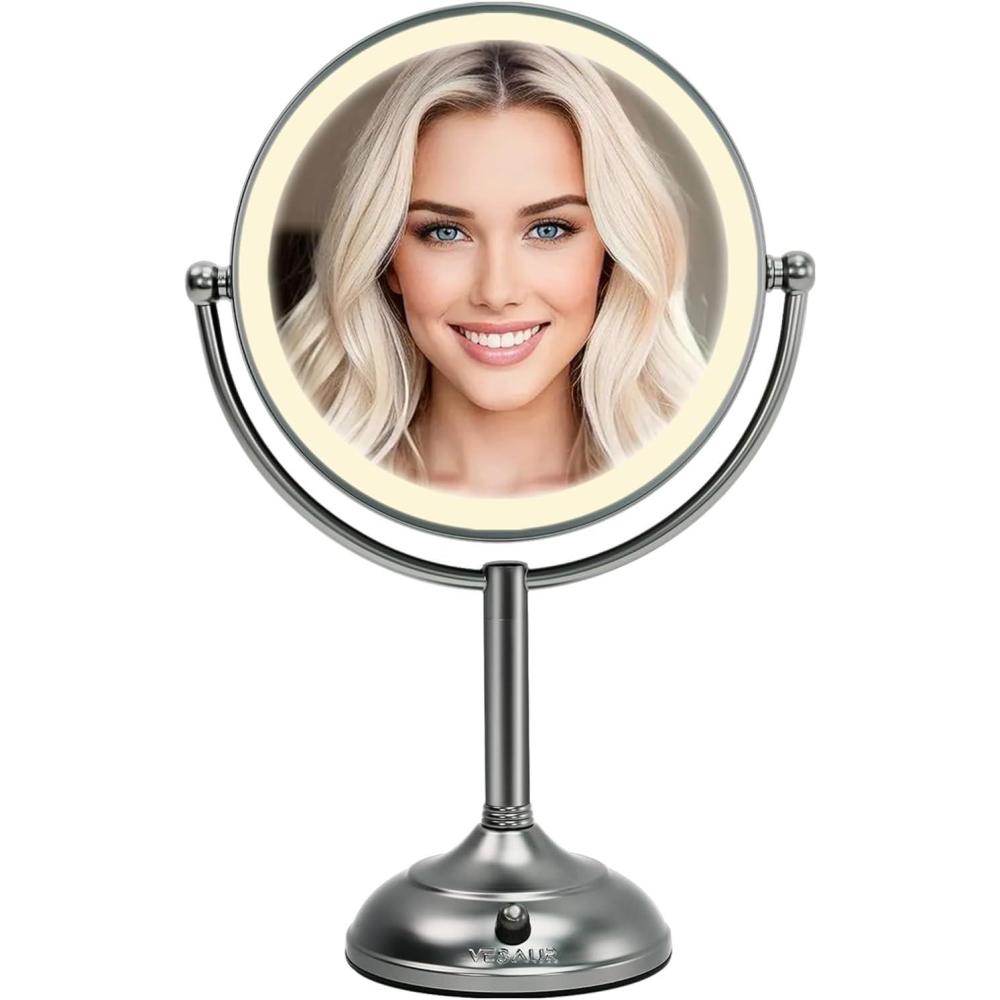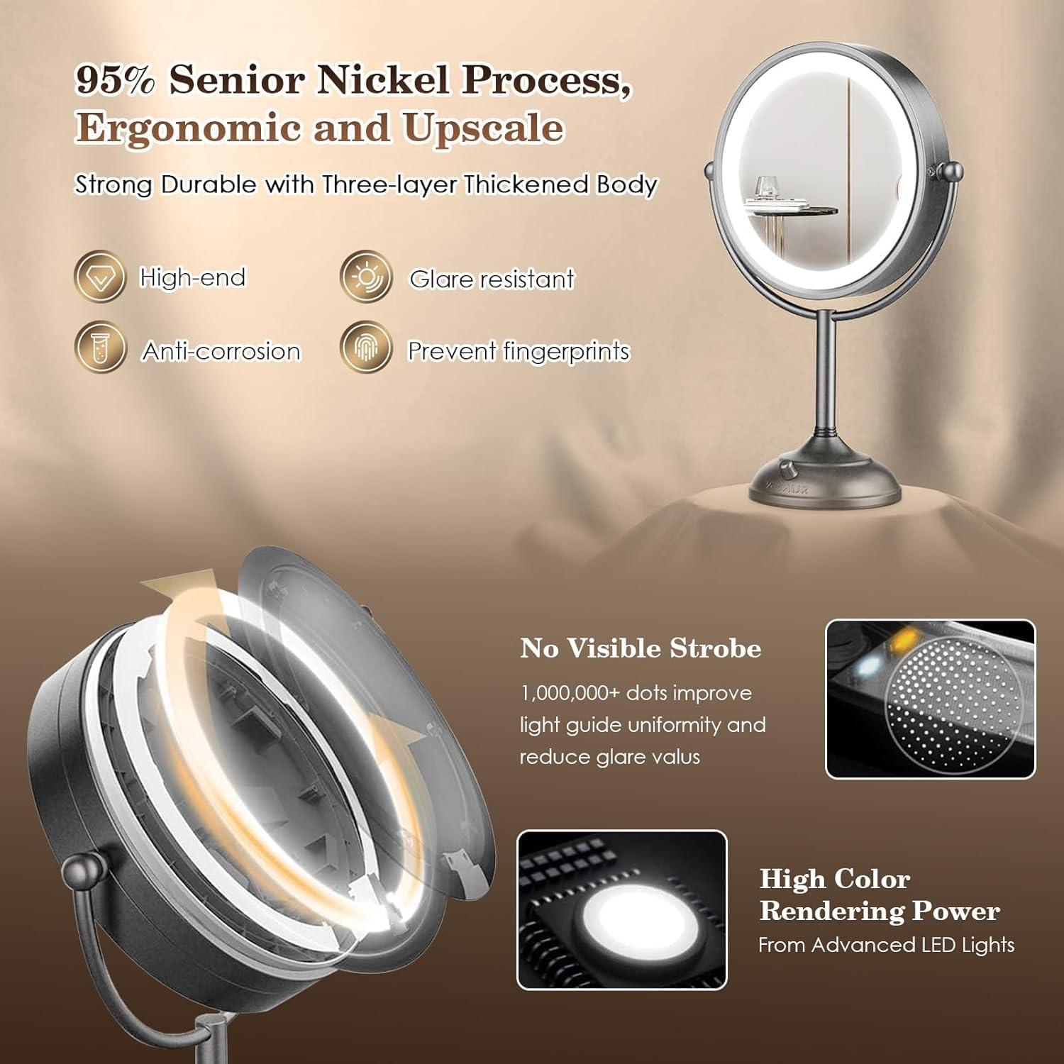 【Senior Pearl Nickel Best Luxurious Gift for Her】VESAUR vanity mirror with lights is made of gorgeous superior Pearl Nickel, chemically stable with strong anti-corrosion properties. No reflection and glare, micro-scratches vanish with gentle polishing. Comfortable lubrication just as touch the pearl and overall appearance combines modern and vintage elements. Ergonomic and beautiful design. Purely handmade ornament and high-end gift. High definition without distortion, other mirrors had distorted lenses in 10x magnification.