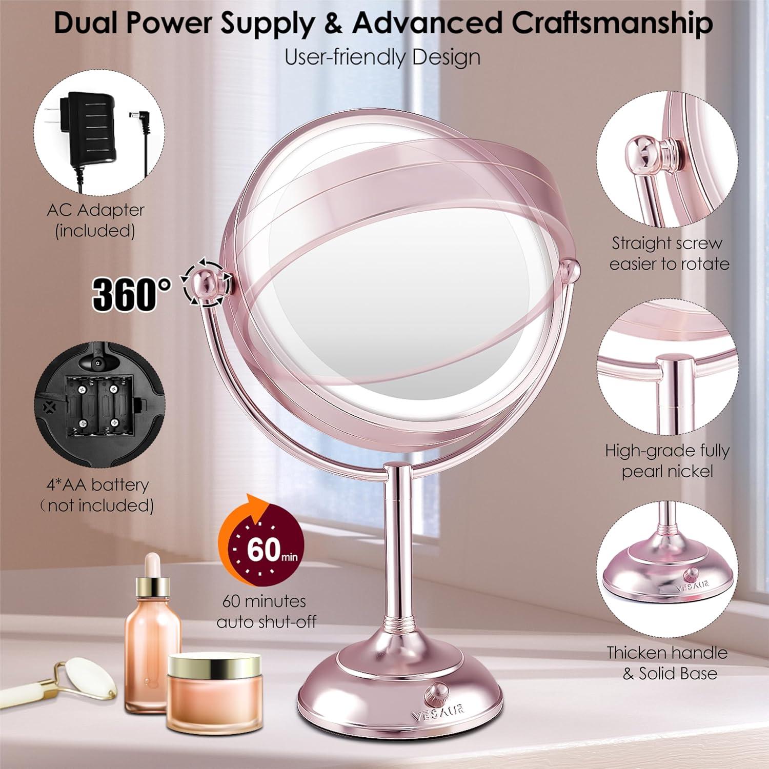 【Senior Pearl Nickel Best Luxurious Gift for Her】VESAUR vanity mirror with lights is made of gorgeous superior Pearl Nickel, chemically stable with strong anti-corrosion properties. No reflection and glare, micro-scratches vanish with gentle polishing. Comfortable lubrication just as touch the pearl and overall appearance combines modern and vintage elements. Ergonomic and beautiful design. Purely handmade ornament and high-end gift. High definition without distortion, other mirrors had distorted lenses in 10x magnification.