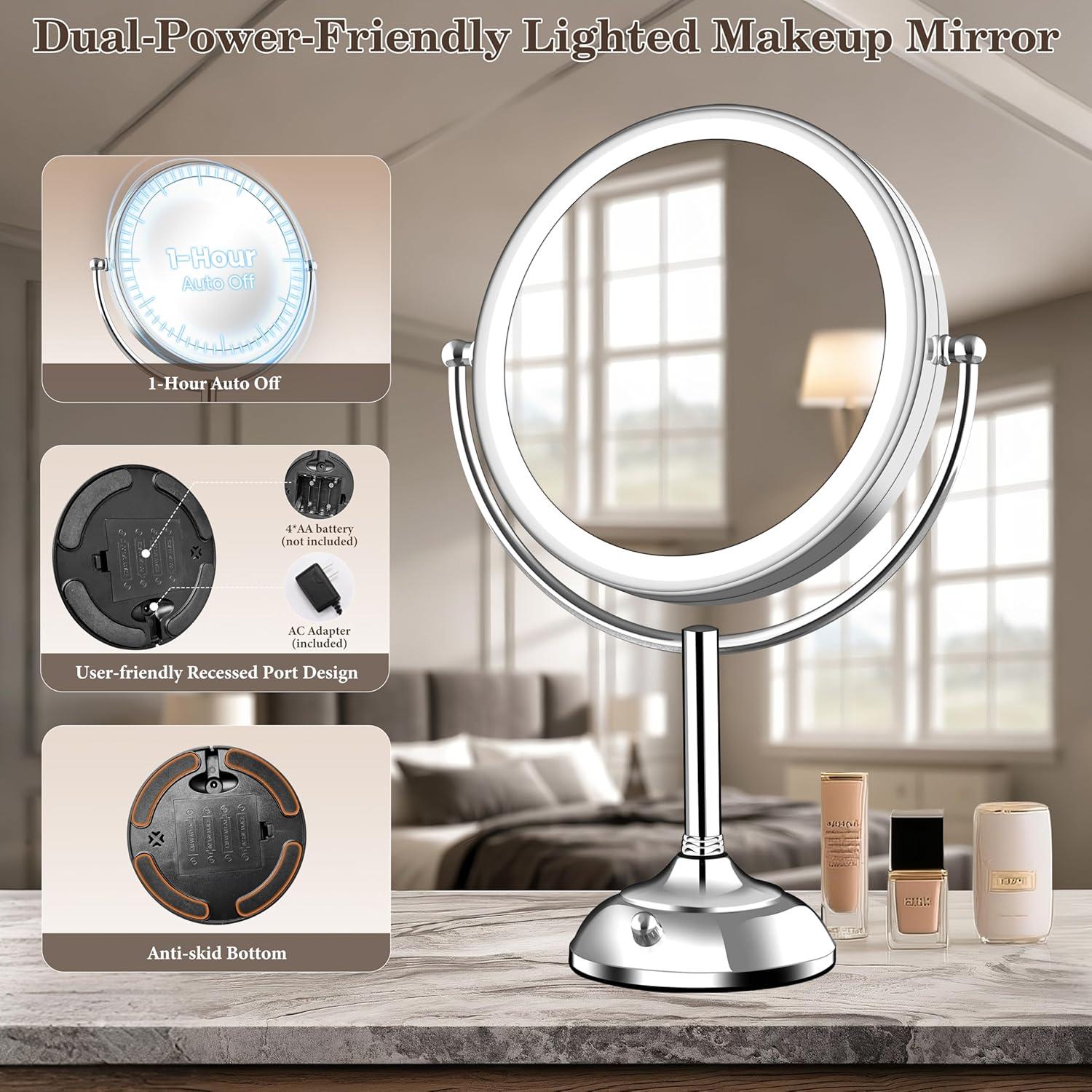 DUAL-POWER Vanity MAKEUP MIRROR 100% BRIGHTNESS OUTPUT NO WORRIES IN CASE OF POWER FAILURE:Enjoy seamless power with intelligent dual-supply lighted makeup mirror with magnification(AC adapter or 4xAAA batteries). The advanced power management chip ensures instant switching (<0.1s) for consistent 100% brightness—no dimming, even during outages. CE/FCC-certified for safety,make up mirror perfect for home or travel, freeing you from cords while delivering reliable, high-quality lighting anywhere