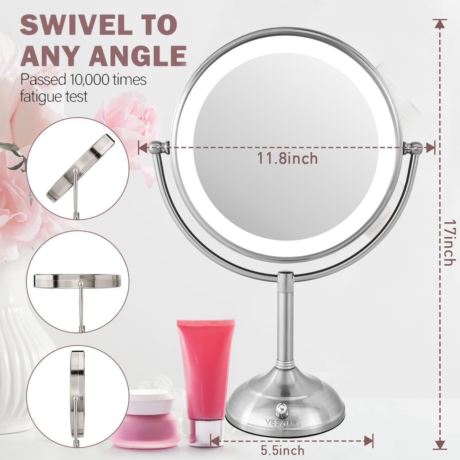 【1x/10x HD Distortion-free Magnification Upgrade Your Grooming Experience】unparalleled precision with the VESAUR lighted makeup mirror, featuring dual magnification options—1x for an overall view and 10x for intricate details. The HD glass delivers a distortion-free, crystal-clear reflection, ensuring perfect makeup application and grooming. Say farewell to static angles with our 360° swivel joint,lighted makeup mirrors allowing effortless adjustment to any angle.Enjoy the ultimate flexibility and convenience to see every part of your face with ease