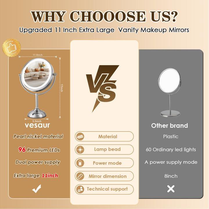 【Super Large 11-inch Mirror with Clear Seamless Crystal Surface】Measuring at 17 inches tall, our magnifying mirror with light features a 11-inch enlarged seamless crystal glass surface, providing you with a flawless reflection that is free from distortion or any unwanted glare.Crafted with a polished surface pearl nickel material, chemically stable and corrosion resistant according to standard S21800, with a corrosion rate of <0.001mm/a.This makeup mirror with lights no reflection, no glare, no fingerprints - just the perfect mirror for all your beauty needs