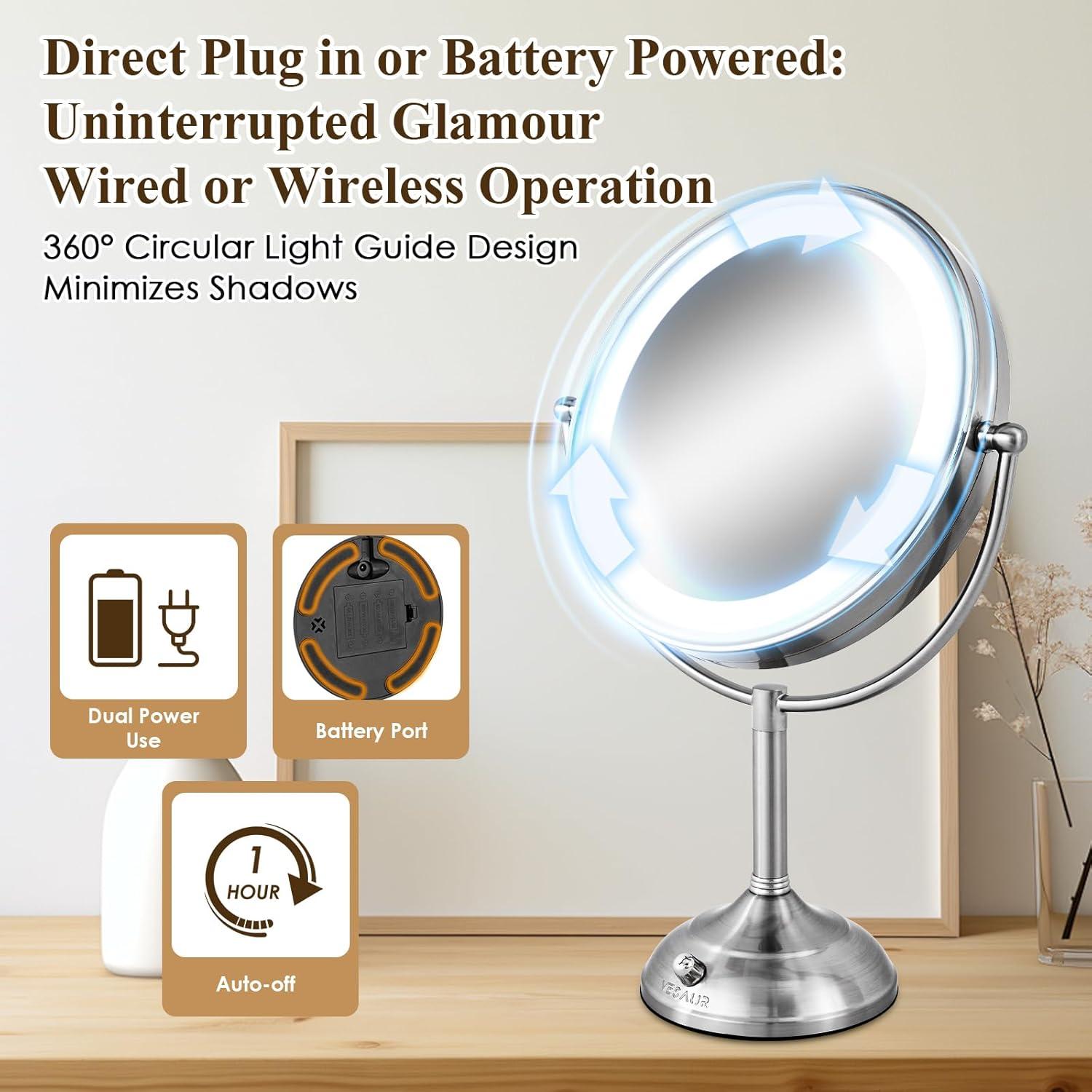 💌【Dual-Power Flexibility & Long-Lasting Battery Life 】Experience ultimate convenience with our 10inch dual-power makeup mirror, offering both plug-in and battery-powered modes for unrestricted use anywhere. The 5000mAh graphene-enhanced lithium battery ensures 30 days of use on a single 2-hour USB-C charge, while the 1-hour auto-shutoff feature conserves energy. Perfect for bedrooms, bathrooms, or on-the-go touch-ups