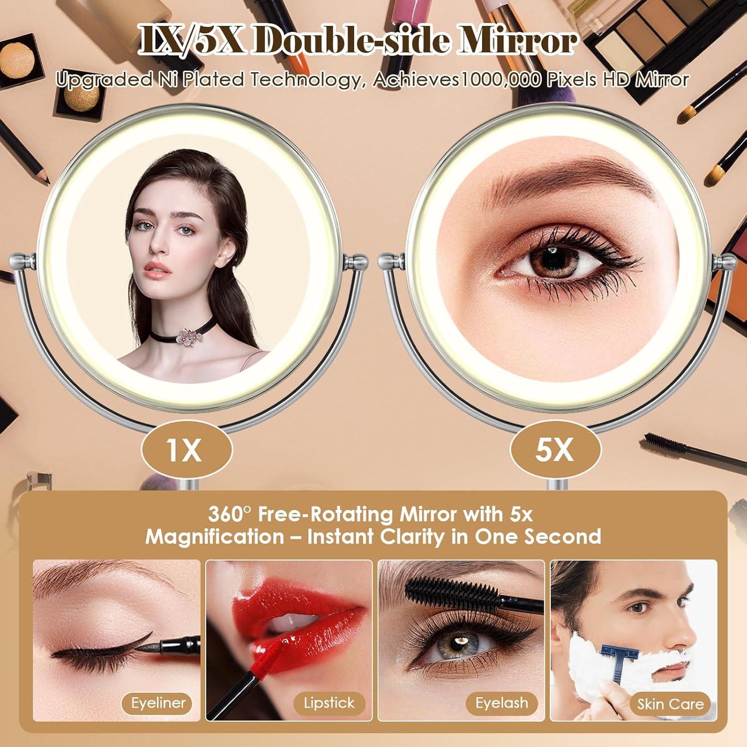 VESAUR 11″ & 9″ HD Lighted Makeup Mirror Set – 1X/5X & 1X/15X Double-Sided Magnification, 3 Lighting Modes & Brightness Adjustment, 5000mAh Rechargeable & Detachable for Travel, for Women