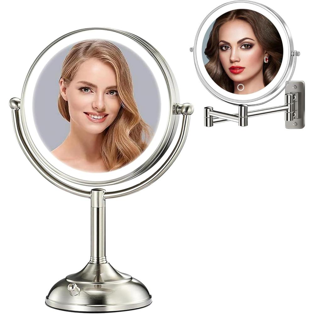💞【Premium Build & Anti-Slip, Anti-Shake Design 】Crafted with luxurious pearl nickel alloy, both mirrors boast unmatched durability, corrosion resistance, and a fingerprint-free finish. The desktop mirror features a reinforced anti-slip base for exceptional stability, while the wall-mounted version includes 360° flexible arms for ergonomic positioning. Both mirrors are built with all-glass light rings, eliminating cheap plastic for a sleek, modern aesthetic.
